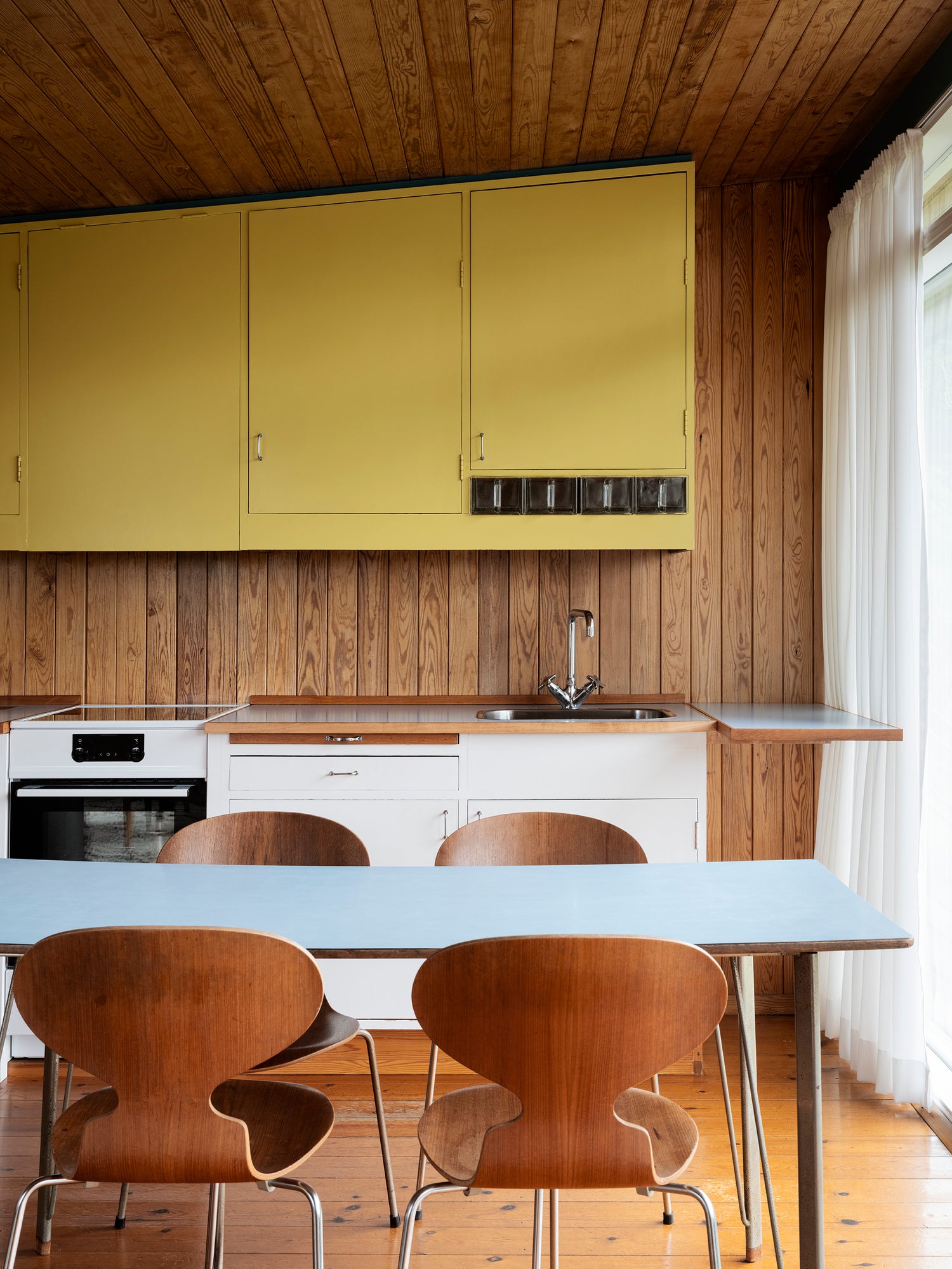 Hver detalje i huset er omhyggeligt udvalgt af Jacobsen og hans hold af arkitekter, og kunstfærdigt placeret for at opnå den optimale balance mellem form og funktion. Køkken- og badevandsinstallationerne er ingen undtagelse. Her pryder Krydsgrebsvandhaner i skinnende krom, og danner de perfekte afsluttende detaljer til hjemmets ikoniske, ultrafunktionelle indretning.