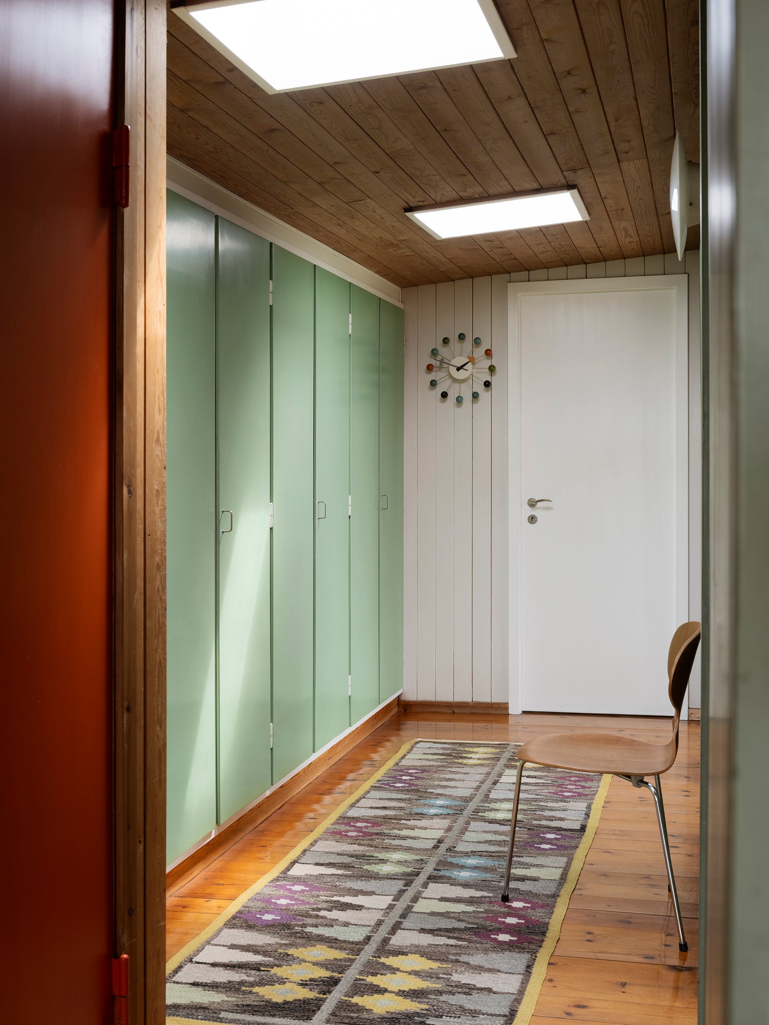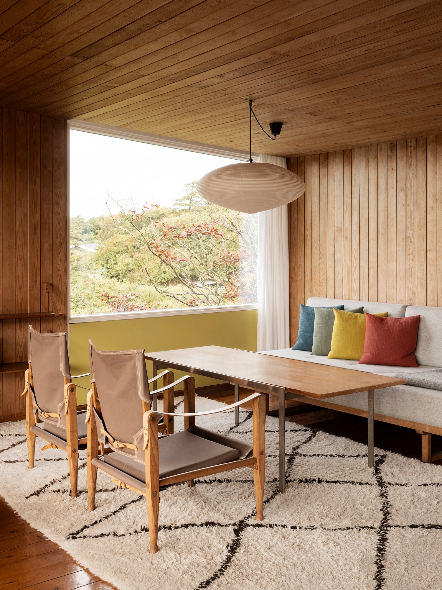 Inde i hjemmet er der legende primærfarver og talrige skjulte designelementer. Farvepaletten er i høj grad inspireret af naturligt træ og suppleret med dristige gule, orange, grønne og blå elementer, der gentages gennem hele huset. Det åbne køkken og stue smelter naturligt sammen og udgør hjertet i hjemmet. Elementer inkluderer en original, fritstående brændeovn og et stort vindue, der indrammer glimt af havet.