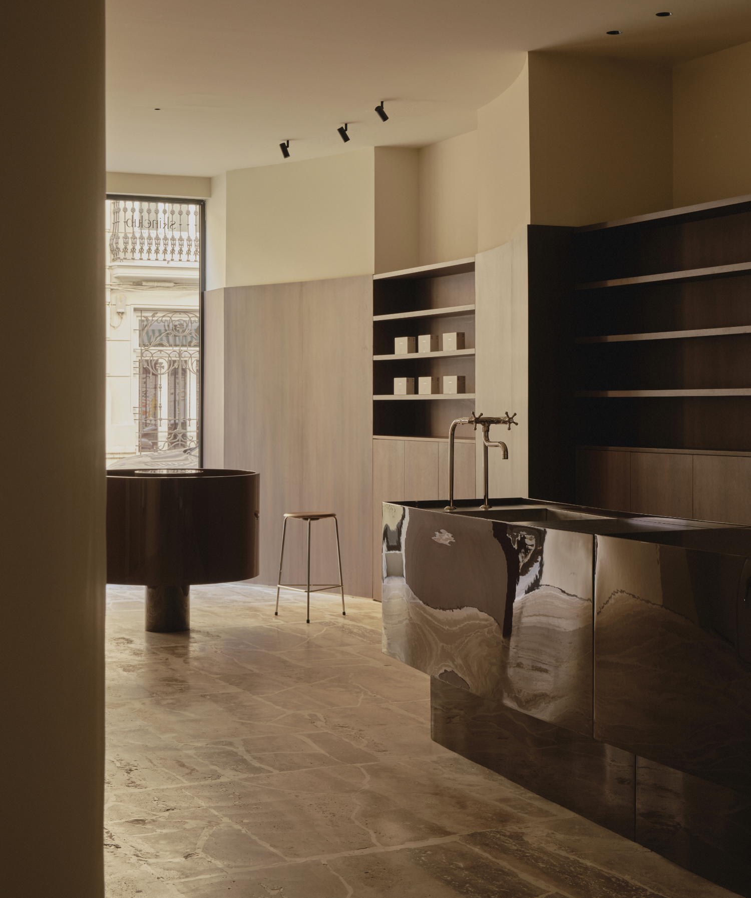 I denne valencianske hudplejeklinik skaber blanke overflader, afdæmpede nuancer og metalliske detaljer en enestående elegant atmosfære. Rummet folder sig organisk ud, hvor bløde kurver former både bevægelsesflowet og det specialdesignede inventar. Christiansborg-armaturet på standerrør indtager en central plads. Hvert element tjener ikke blot et praktisk formål, det bliver en bærende del af rummets identitet.
